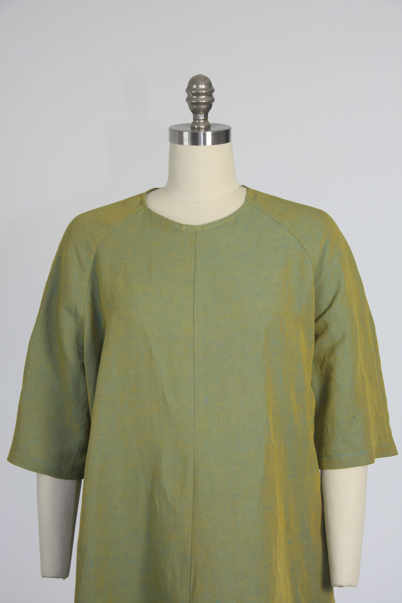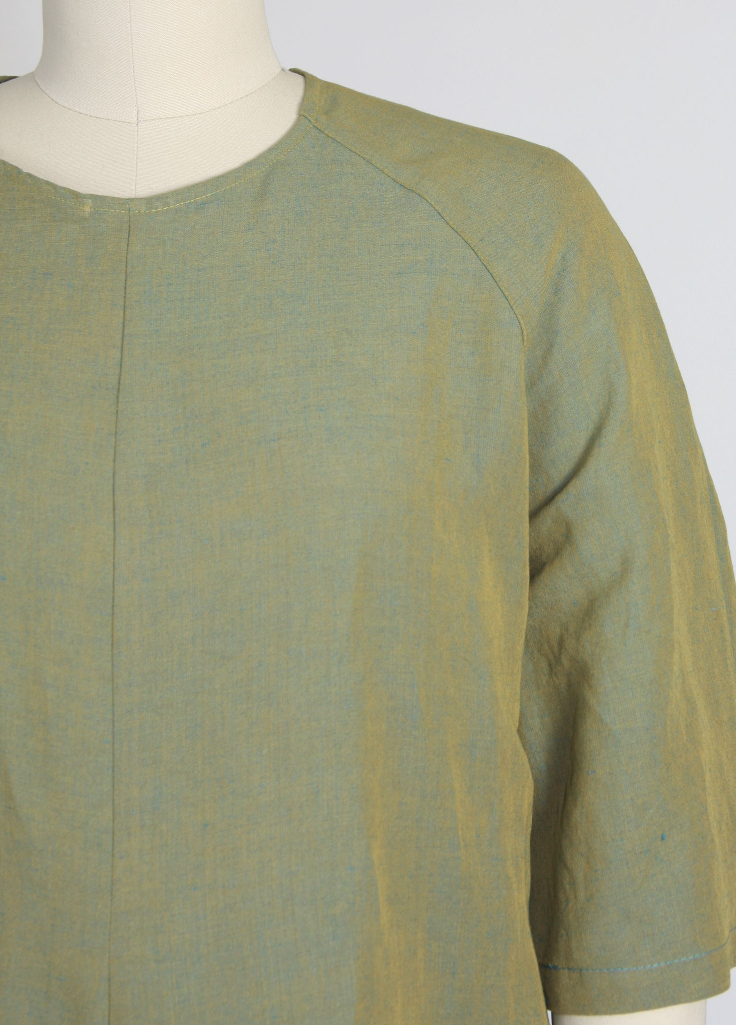 Das Shirt ist aus einem Baumwollmix handgefertigt und schließt mit einer Knopfreihe in der hinteren Mitte.