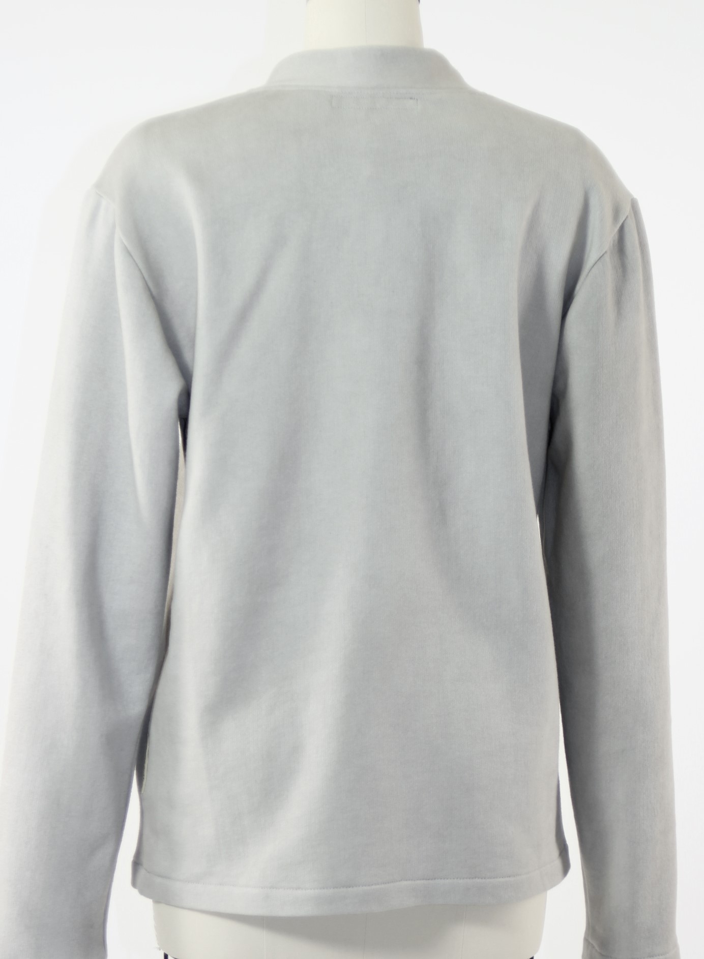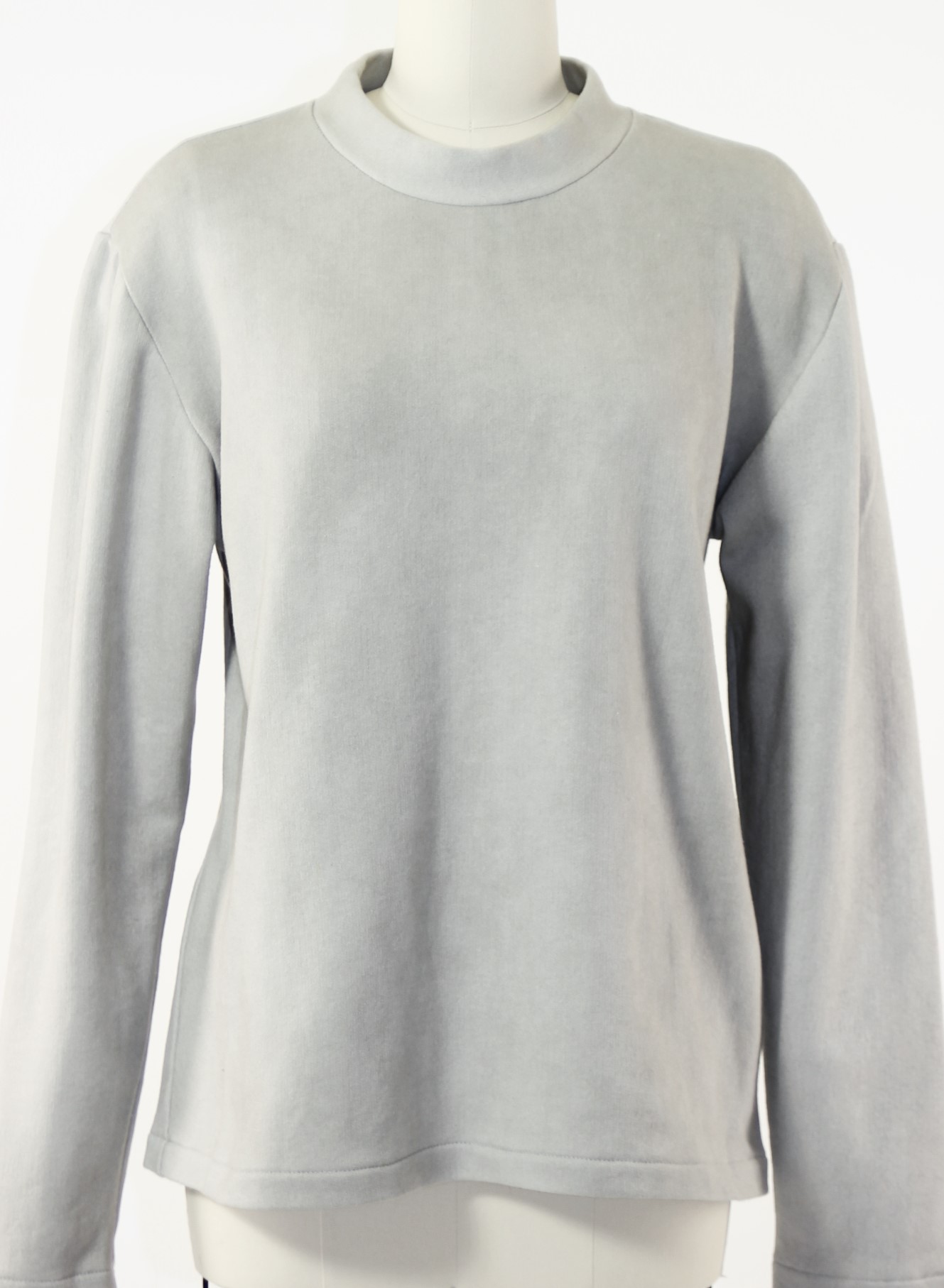 Der Pullover ist aus einem Baumwollstoff handgefertigt und hat einen Rundhalsausschnitt.