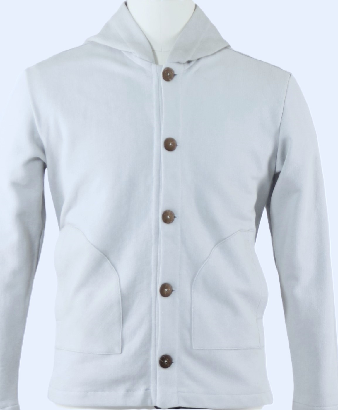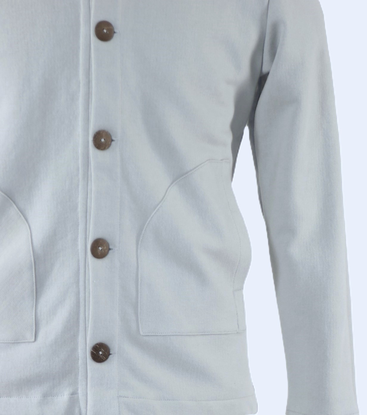 Die Sweat Jacke ist aus einem Baumwollstoff handgefertigt und schließt mit Knöpfen in der vorderen Mitte.