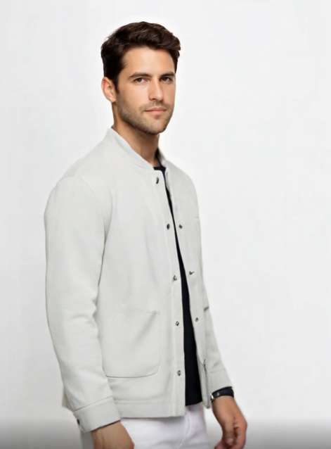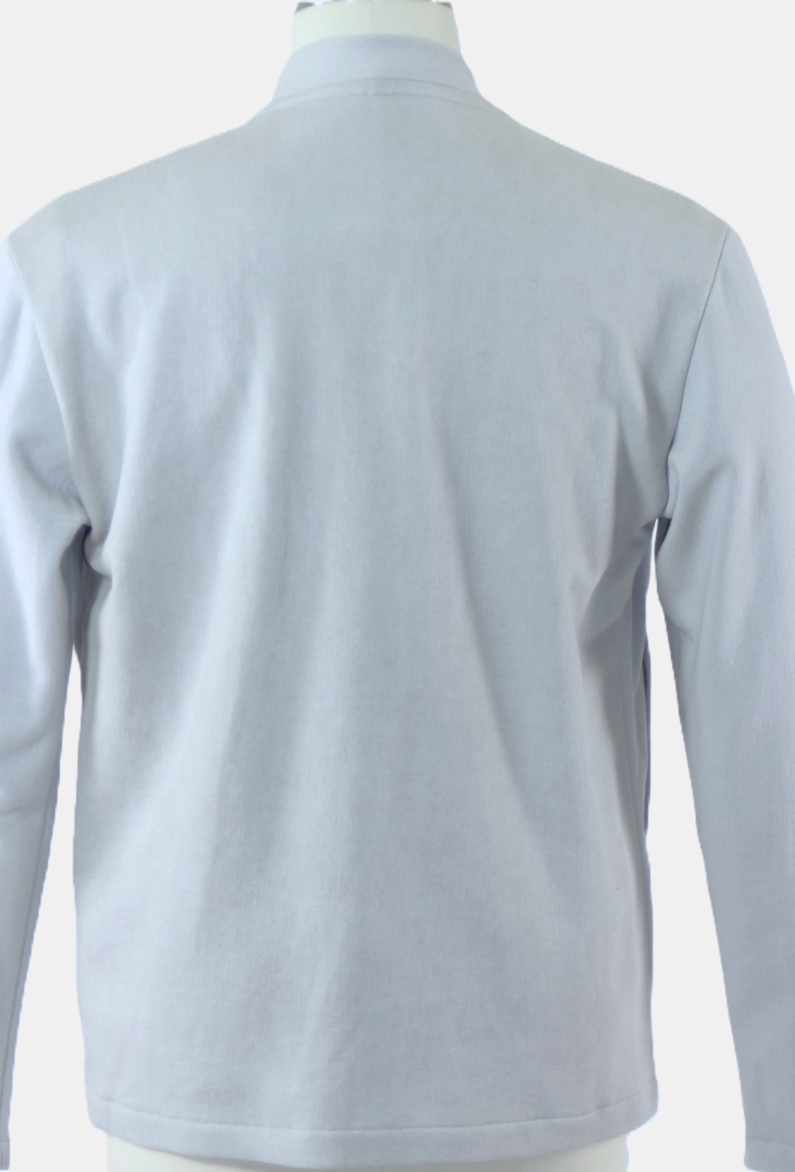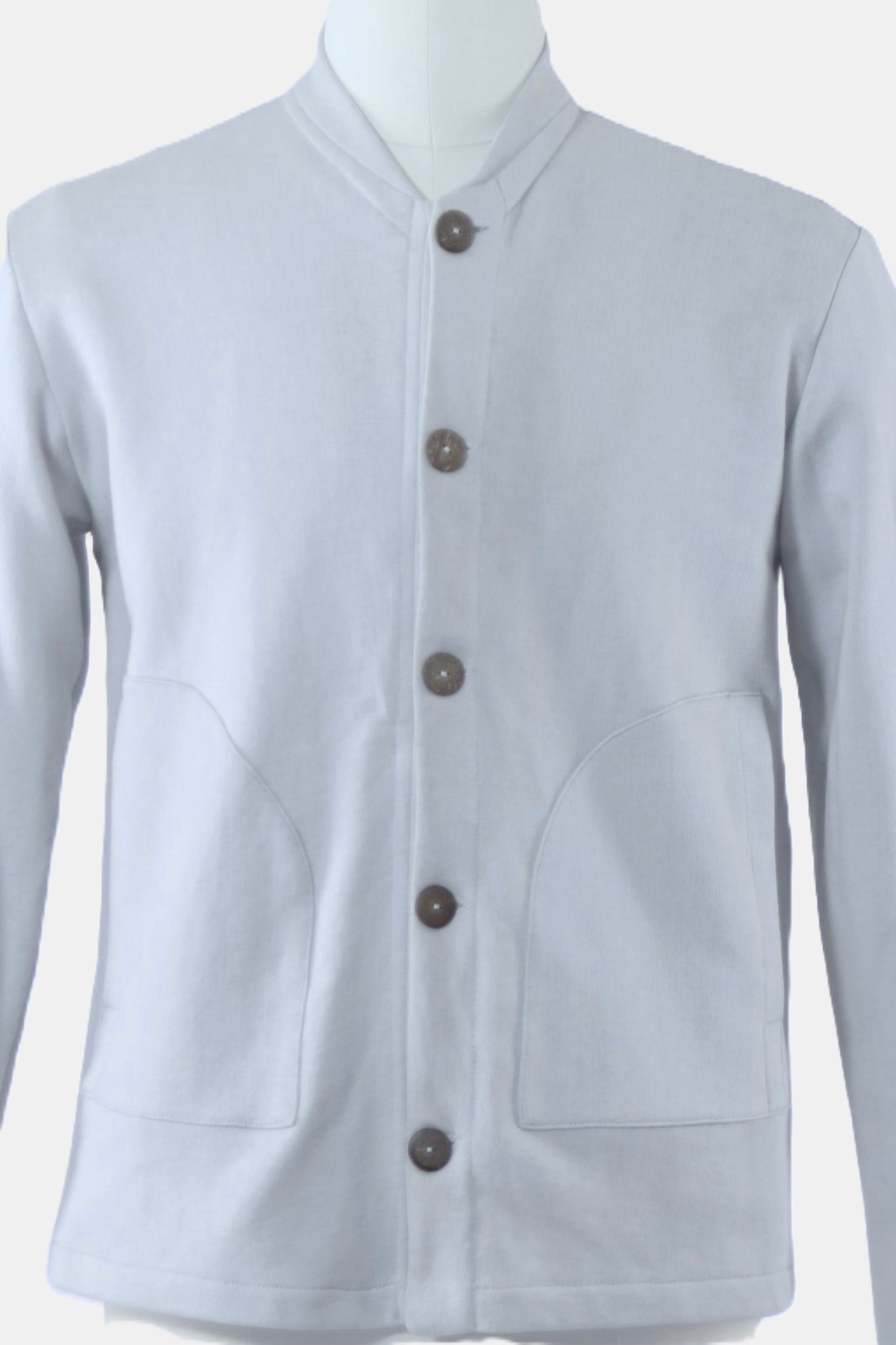 Die Sweat Jacke ist aus einem Baumwollstoff handgefertigt und schließt mit Knöpfen in der vorderen Mitte.