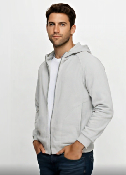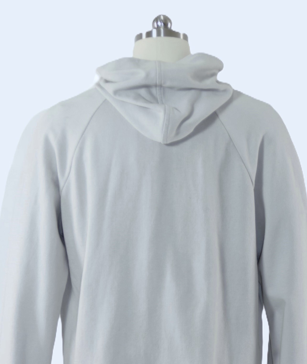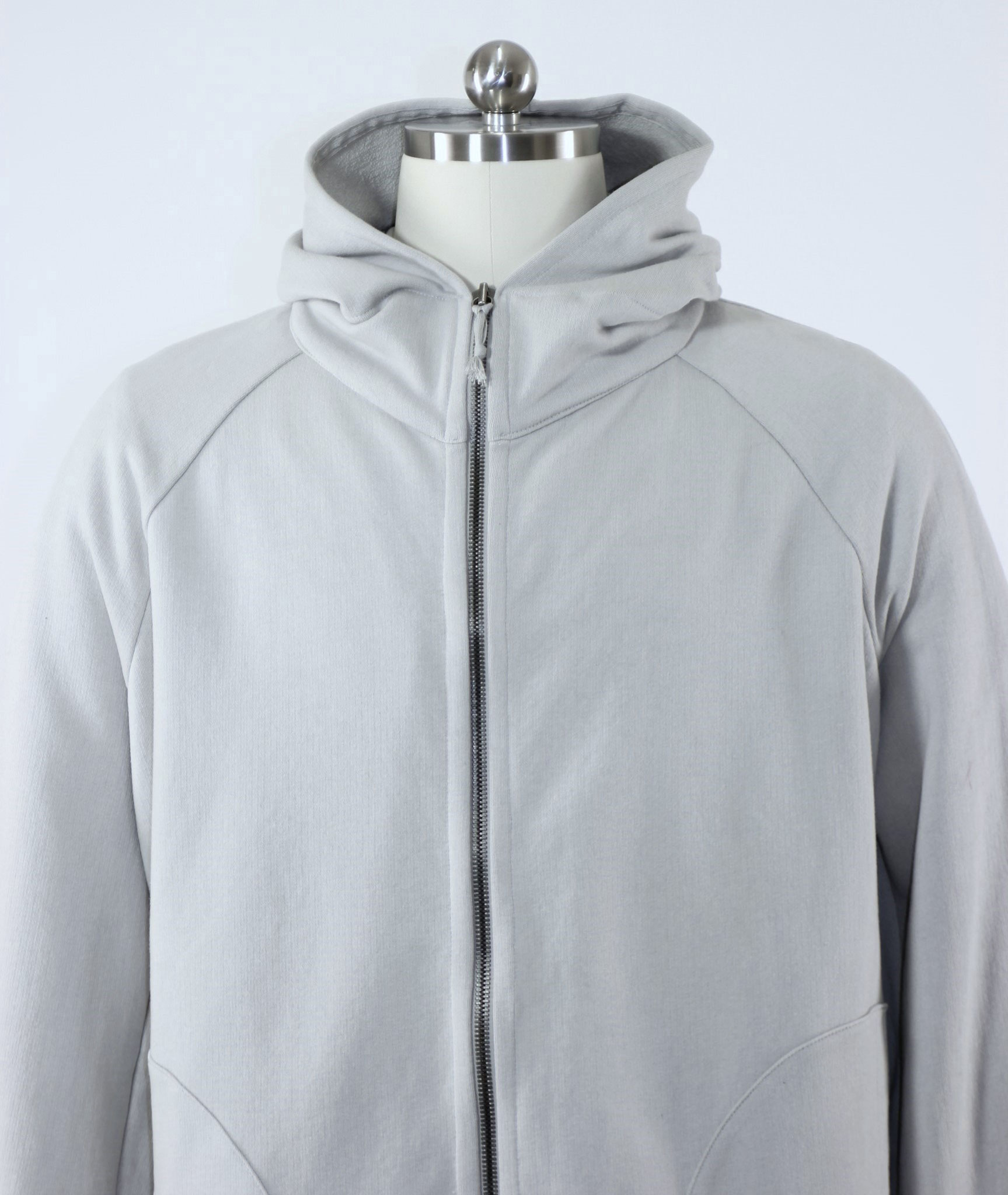 Die Sweat Jacke ist aus einem Baumwollstoff handgefertigt und schließt mit einem Reißverschluss in der vorderen Mitte.